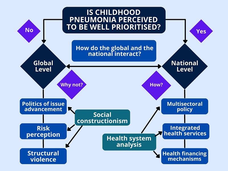 I am using a mixed methods approach to observe how global health actors perceive pneumonia’s political prioritisation in the context of social theories of prioritisation and neglect. This will be contrasted with the national reality of pneumonia control in Bangladesh’s health system to draw comparisons on the relationship between these global narratives and the national empirical reality. I am answering three main research questions: